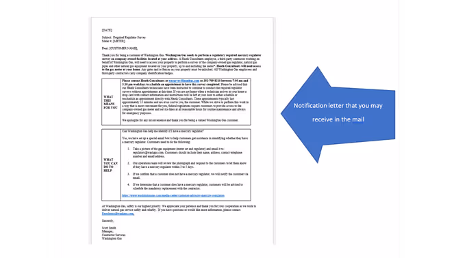 Washington Gas has partnered with Heath Consultants to perform a survey of company-owned gas regulators, natural gas pipes and other natural gas equipment located on properties throughout the Washington Gas service territory. If your service address is believed to have a mercury regulator, Heath Consultants will need access to your gas meter. Any gates and/or fences on your property must be unlocked.