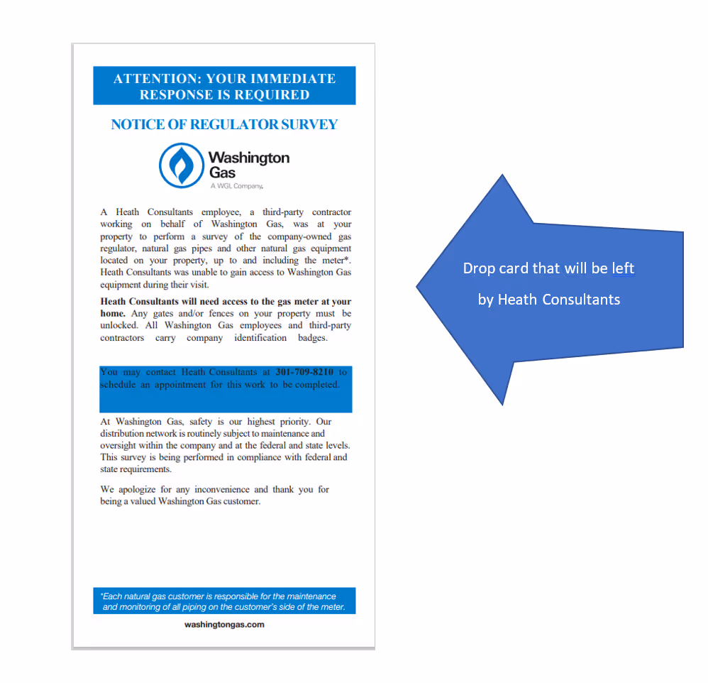 Please contact Heath Consultants at wgsurvey@heathus.com or 301-709-8210 between 7:00 am and 3:30 pm weekdays to schedule an appointment to have this survey completed. Please be advised that our Heath Consultants technicians have been instructed to continue to conduct the required regulator surveys without appointments at this time.